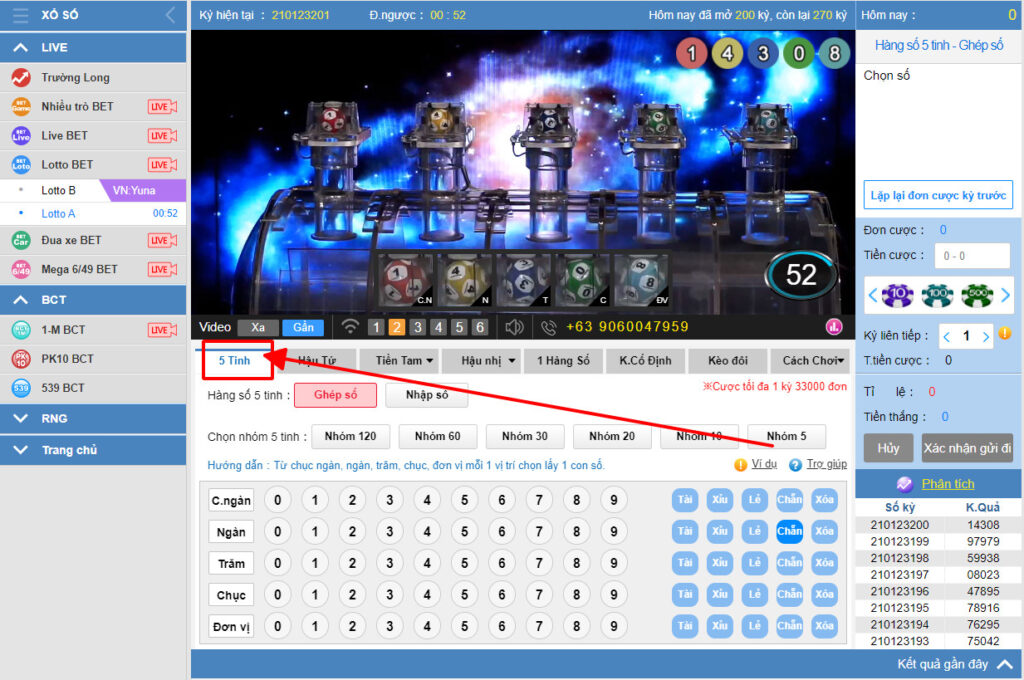Đặt cược 5 chữ số liên tiếp để khớp với 5 chữ số đã định trên màn hình.