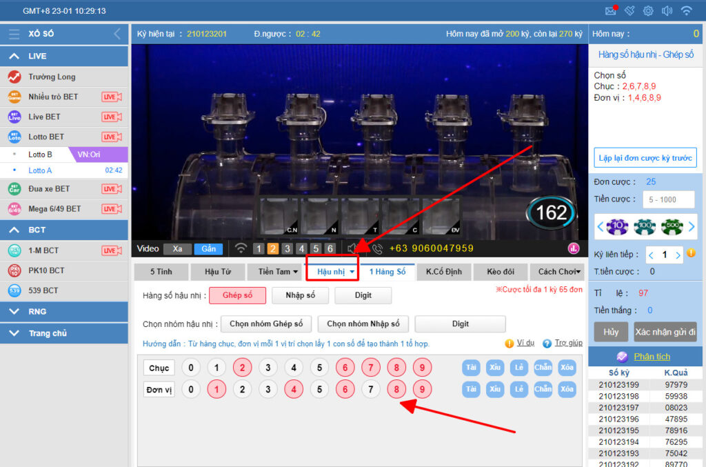 Hướng dẫn chơi Lotto bet Hau Nhi Hướng dẫn cách chơi đặt cược Lotto: Để đặt cược vào hậu nhị, người chơi có hai hình thức chơi: song thủ tổng hợp hoặc hậu nhị phân đơn hình. Cách chơi Bài nhị phân với nhóm phức, người chơi tự chọn số có sẵn trên máy mà không cần phải nhập tay, đối với Bài nhị phân nhóm đơn thì người chơi có thể vào tay hoặc chép số có sẵn.