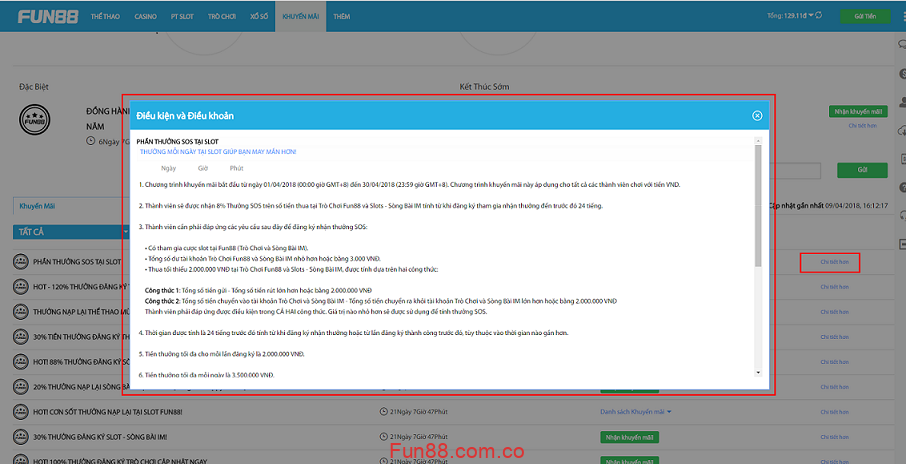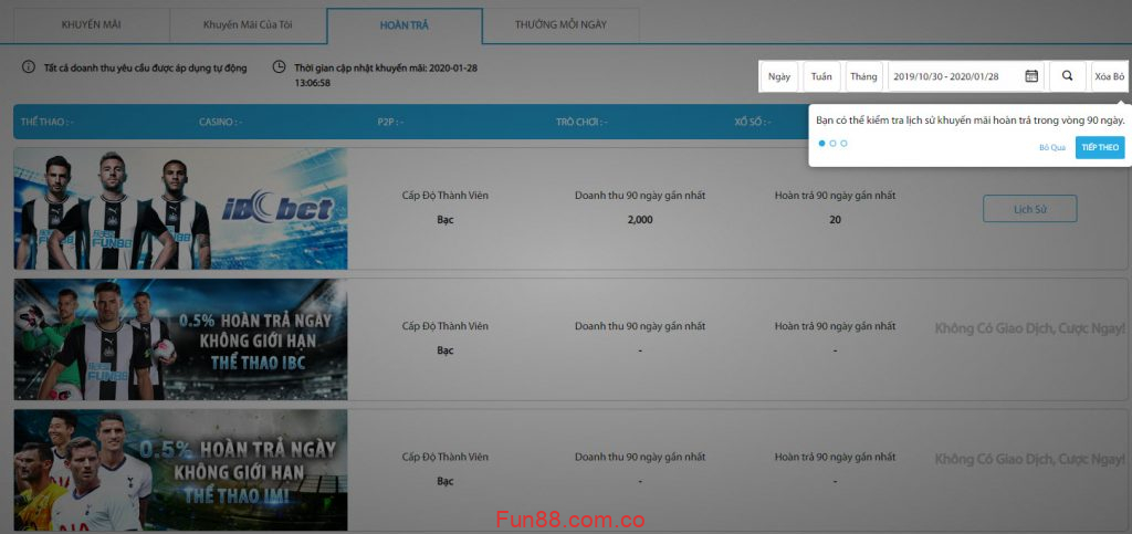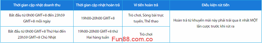 - Tài khoản kinh tế của nhà cái sẽ được hoàn tiền 0,5% không giới hạn mỗi ngày, khoản hoàn trả này sẽ dựa trên doanh thu tại Fun88 thể thao (bao gồm Fun88, IBC, CMD, IBC thể thao) trong thời gian khuyến mãi.