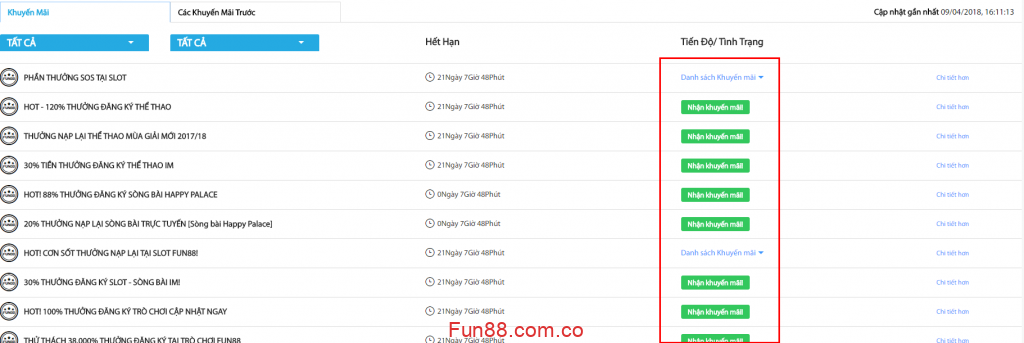 Nhấp vào “tiền thưởng / đặc biệt quan trọng”, sẽ hiển thị tiến độ / trạng thái của từng chương trình khuyến mãi => “Tham gia ngay” để đăng ký.