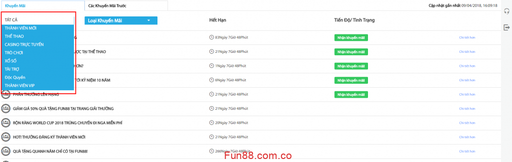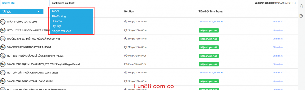 Chọn danh sáchbạn có thể chọn loại khuyến mãi (Tất cả, tiền thưởng, giảm giá, đặc biệt, các loại khác)