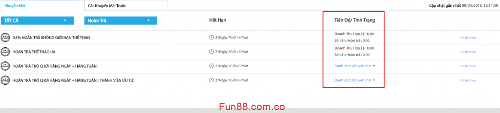 Chọn “Hoàn lại tiền”, sẽ hiển thị tiến độ / trạng thái của mỗi chương trình khuyến mãi.