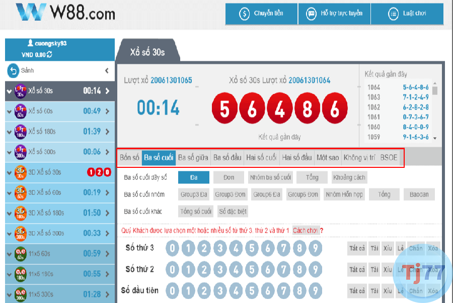 - Thị trường tiếp theo là Lotto 30s, 60s, 180s và 300s. Không giống như Loto 11 × 5 trên W88, thị trường này chỉ có 10 viên bi. Các viên bi được rút ra tự động để rút ra 5 viên bi được tính từ phải sang trái.