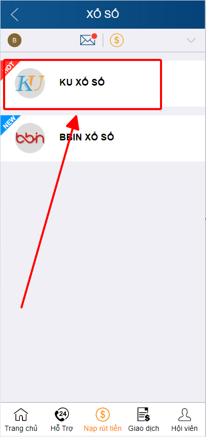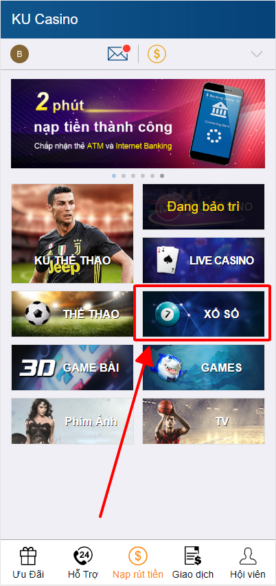 BƯỚC 1: Đăng nhập vào sòng bạc Ku6108vn và chọn mục xổ số. chọn vào xổ số việt nam.